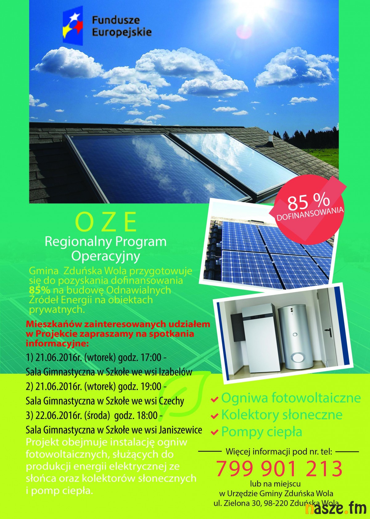 Gmina Zduńska Wola rozpoczyna przygotowania do pozyskania zewnętrznych środków finansowych na kolejną inwestycję proekologiczną. Chodzi o instalację na obiektach prywatnych ogniw fotowoltaicznych służących do produkcji energii elektrycznej ze słońca, kolektorów słonecznych oraz pomp ciepła, a co za tym idzie umożliwienia mieszkańcom znacznego obniżenia rachunków za prąd i ciepło przy jednoczesnej ochronie środowiska.