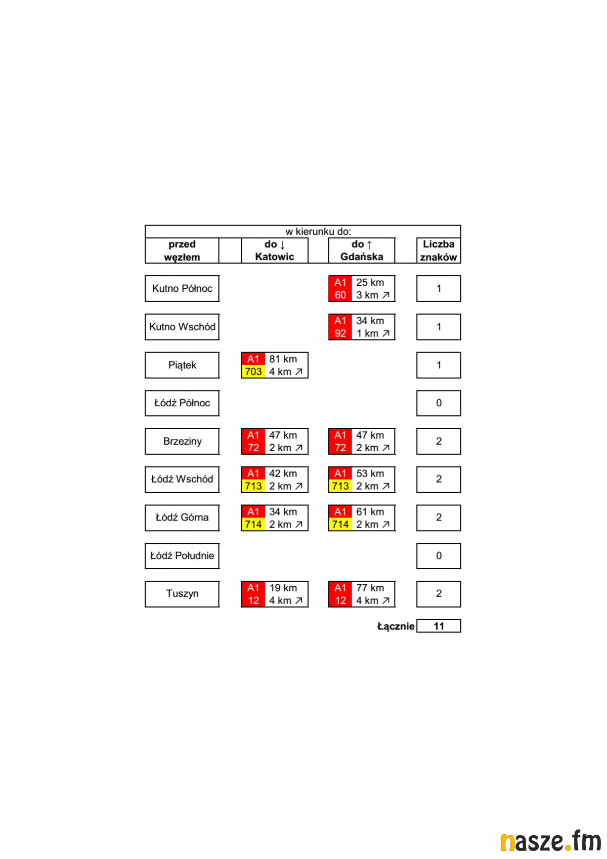 W tej sytuacji łódzki Oddział Generalnej Dyrekcji Dróg Krajowych i Autostrad podjął decyzję o umieszczeniu przy autostradzie dodatkowego systemu znaków informacyjnych o możliwości uzupełnienia paliwa.11 znaków D-23 na dodatkowym białym tle będzie umieszczonych w sąsiedztwie węzłów (z wyjątkiem Łódź Północ i Łódź Południe). Będą one informowały jak daleko jest do najbliższej stacji paliw usytuowanej przy autostradzie A1 oraz ile kilometrów musimy pokonać, aby zatankować samochód zjeżdżając na najbliższym węźle. Znaki mają być zamontowane w ciągu kilku najbliższych tygodni, przy czym uwzględnią fakt, że wkrótce zostaną uruchomione stacje paliwowe w Miejscach Obsługi Podróżnych w Krzyżanowie (na południe od Kutna), co powinno nastąpić w podobnym czasie.