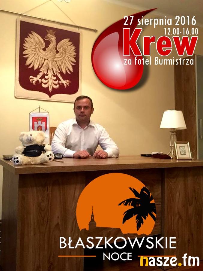 Również 27 sierpnia będzie można pomóc. Burmistrz Gminy i Miasta Błaszki Karol Rajewski wraz z Młodzieżową Radą Doradczą organizuje niecodzienną akcję "Krew za fotel Burmistrza". Jest to zbiórka krwi dla chorej trzyletniej Zosi. Nie było by w niej nic zaskakującego, gdyby nie fakt, że krwiodawcy będą mogli oddać krew w gabinecie burmistrza, w nagrodę zasiąść w jego fotelu i zrobić sobie pamiątkowe zdjęcie.
