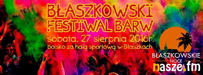 Urząd Gminy i Miasta Błaszki oraz Hufiec Sieradz - 44. Błaszkowska Drużyna Harcerska ,,Parasol'' zapraszają na Błaszkowski Festiwal Barw. Znana wszystkim i popularna bitwa kolorowym proszkiem zawita do Błaszek.