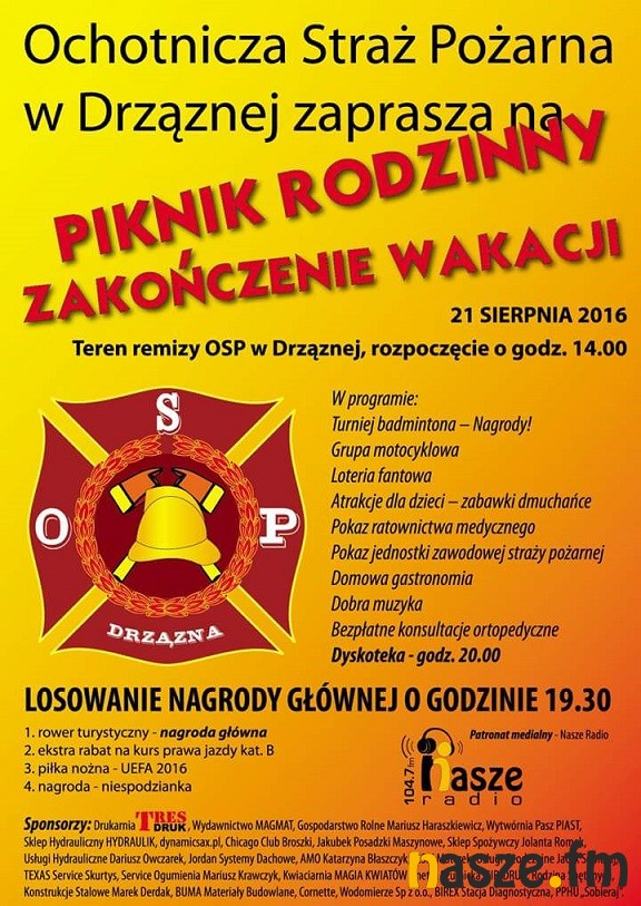 W programie imprezy m.in. turniej badmintona. Na zwycięzców czekają atrakcyjne nagrody. W Drząznej pojawi się też grupa motocyklowa. Będzie też można zobaczyć specjalny pokaz w wykonaniu zespołu ratownictwa medycznego oraz strażaków zawodowych. Warto też będzie stanąć w kolejce do loterii. Dla najmłodszych będzie wesołe miasteczko, a całość zakończy dyskoteka. Piknik odbędzie się na terenie remizy strażackiej, początek o godz. 14. Szczegóły na plakacie.