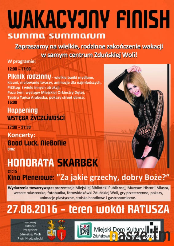 Jutro (27 sierpnia) na terenie wokół zduńskowolskiego ratusza odbędzie się impreza z okazji pożegnania wakacji. Nie zabraknie licznych atrakcji dla najmłodszych oraz koncertów. Na scenie zaprezentuje się m. in. Honorata Skarbek.
