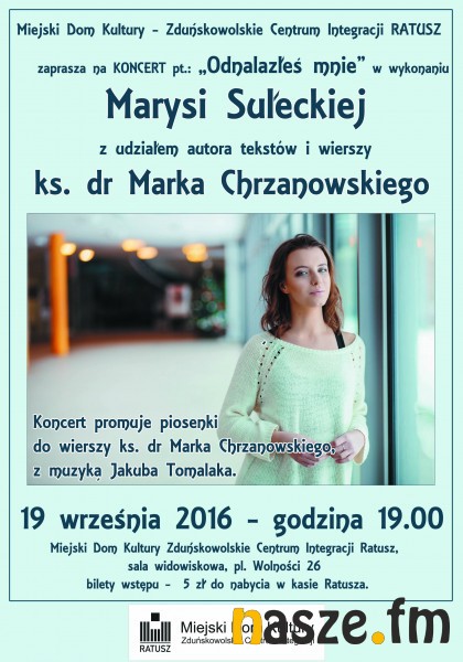 Dzisiaj w Ratuszu odbędzie się koncert Marysi Sułeckiej - utalentowanej wokalistki, która zaśpiewa utwory do poezji ks. dr Marka Chrzanowskiego. Koncert będzie połączony ze spotkaniem z popularnym orionistą.