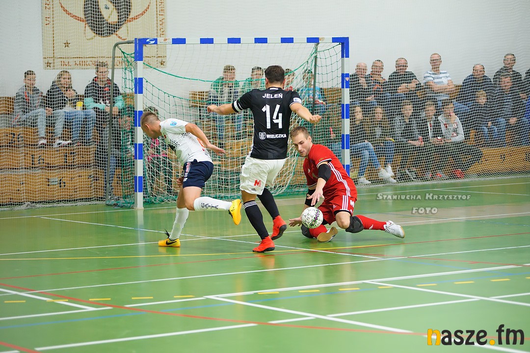 Gospodarze rozpoczęli od mocnego uderzenia, już w 47. sekundzie spotkania do bramki gości trafił Daniel Krawczyk, który wykorzystał błąd bramkarza. Paweł Kurowski dalekim wyjściem chciał ubiec naszego snajpera, ale minął się z piłką i tym samym podarował Mistrzom Polski pierwsza bramkę. Niestety, strzelec gola musiał opuścić boisko po 9. minutach gry, po jednym ze starć z rywalem Krawczyk doznał bolesnego urazu, a z placu gry znieśli go koledzy. Pierwsza połowa była wyrównana, goście często gościli pod bramką Dariusza Słowińskiego, ale ten spisywał się bez zarzutu. Zawodnicy z Wieliczki grali twardo i często przy tym faulowali, już w 15. minucie popełnili 6 przewinień, a przedłużony rzut karny pewnie wykorzystał Mariusz Milewski. Do przerwy utrzymał się wynik 2:0.