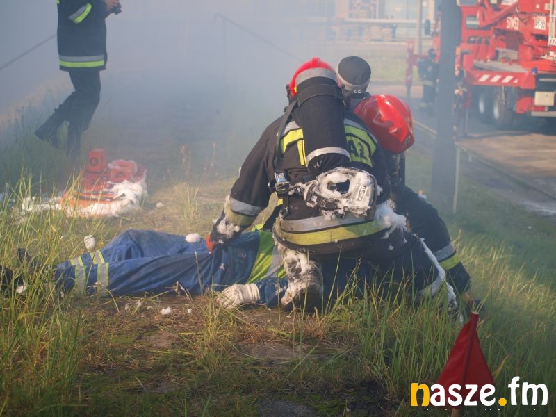 - Głównym założeniem naszych ćwiczeń był wyciek asfaltu z jednego ze zbiorników. Podczas wycieku ten asfalt zapalił się. Mieliśmy dwie osoby poszkodowane. Musieliśmy udzielić pierwszej pomocy, zatamować wyciek i ugasić palący się asfalt. Dodatkowo pojawiło się takie utrudnienie. W pobliskim budynku nastąpił wybuch butli z acetylenem. Podczas prac spawalniczych zapaliły się węże przy tych butlach. Tam mieliśmy jedną osobę poszkodowaną. Dwóch pracowników zgubiło się i musieliśmy je odnaleźć i żeby było jeszcze ciekawiej, to podczas tego drugiego epizodu jednego z pracowników przygniótł worek z posypką do papy. Myślę, że ćwiczenia bardzo ciekawe - wyjaśnia Grzegorz Styczyński, który dowodził akcją.