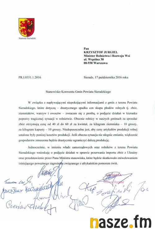 Konwent Gmin Powiatu Sieradzkiego przyjął stanowisko w sprawie spadku cen skupu zbóż, ziemniaków, warzyw i owoców. Zostało ono skierowane do ministra rolnictwa i rozwoju wsi Krzysztofa Jurgiela.