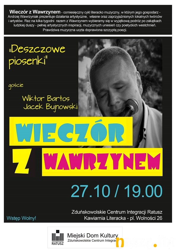 - Część tych piosenek będzie faktycznie deszczowa. Ponieważ zbliża się 1 listopada, więc też nawiążę do tych, których już nie ma wśród nas. Będę miał także gościa, a będzie nim Wiktor Bartos, mój muzyczny przyjaciel, z którym dawno temu razem ze mną dotykał piosenki harcerskiej - mówi Andrzej Wawrzyniak, pomysłodawca cyklu "Wieczór z Wawrzynem".