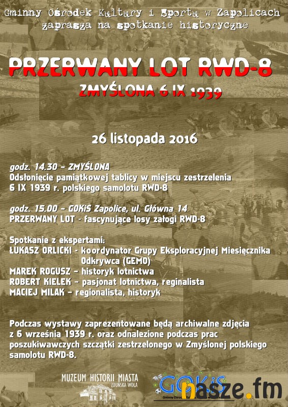 6 września 1939 r. w miejscowości Zmyślona Niemcy zestrzelili polski samolot łącznikowy RWD-8 z 6. Plutonu Łącznikowego "Armii Poznań", którym lecieli kpr. Stanisław Malisz oraz kpt. Władysław Boczoń. Przez lata był to jeden z najbardziej tajemniczych i niewyjaśnionych epizodów Wojny Obronnej 1939 r. w naszym regionie, aż do 2014 r. Już w najbliższą sobotę (26.11) w Gminnym Ośrodku Kultury i Sportu w Zapolicach będzie można poznać niesamowitą historię związaną z przerwanym w Zmyślonej lotem RWD-8.