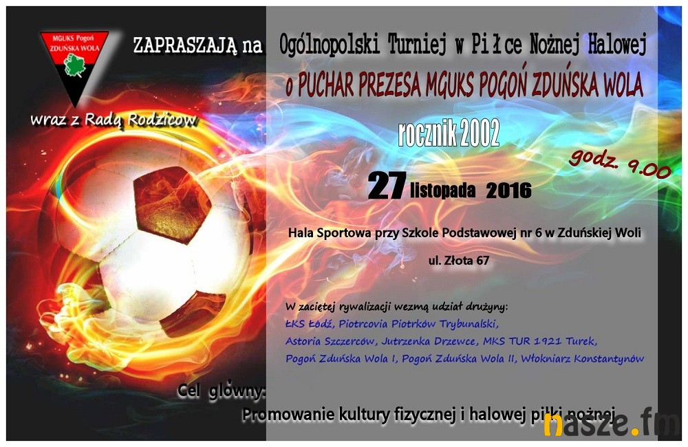 W niedzielę (27.11) w hali Szkoły Podstawowej nr 6 w Zduńskiej Woli odbędzie się piłkarski turniej trampkarzy (rocznik 2002 i młodsi) o Puchar Prezesa MGUKS Pogoń Zduńska Wola.