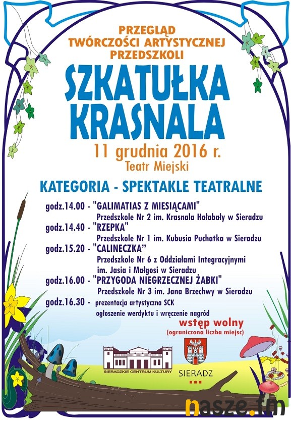 Poniżej prezentujemy program tegorocznego przeglądu. Występy przedszkolaków w Teatrze Miejskim w Sieradzu rozpoczną się ( 4 i 11 grudnia ) o godz. 14:00.