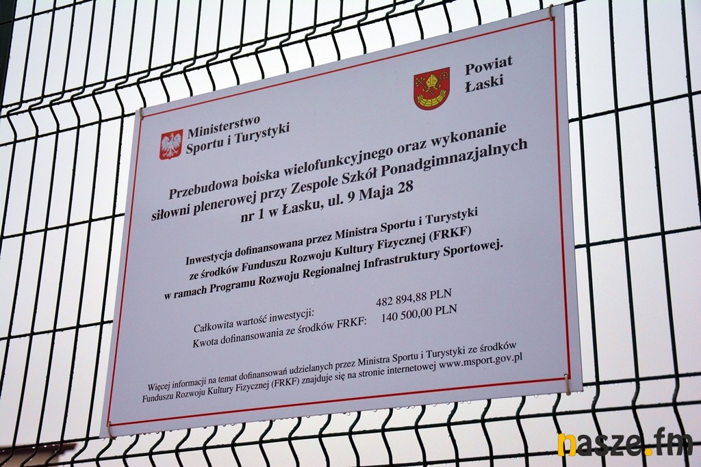 Przebudowa boiska wielofunkcyjnego oraz wykonanie siłowni plenerowej przy Zespole Szkół Ponadgimnazjalnych nr 1 w Łasku kosztowały budżet powiatu łaskiego łącznie 482.894,88 złotych, w tym 140.500 złotych stanowiło dofinansowanie przyznane przez Ministra Sportu i Turystyki ze środków Funduszu Rozwoju Kultury Fizycznej.