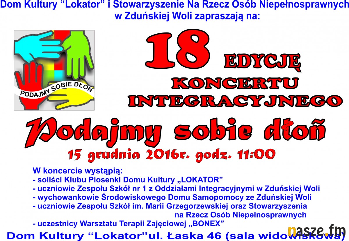 Dom Kultury "Lokator" oraz Stowarzyszenie Na Rzecz Osób Niepełnosprawnych zapraszają na 18. edycję koncertu integracyjnego pt. "Podajmy sobie dłoń". Impreza w czwartek 15 grudnia odbędzie się w sali widowiskowej DK "Lokator" przy ul. Łaskiej 46.