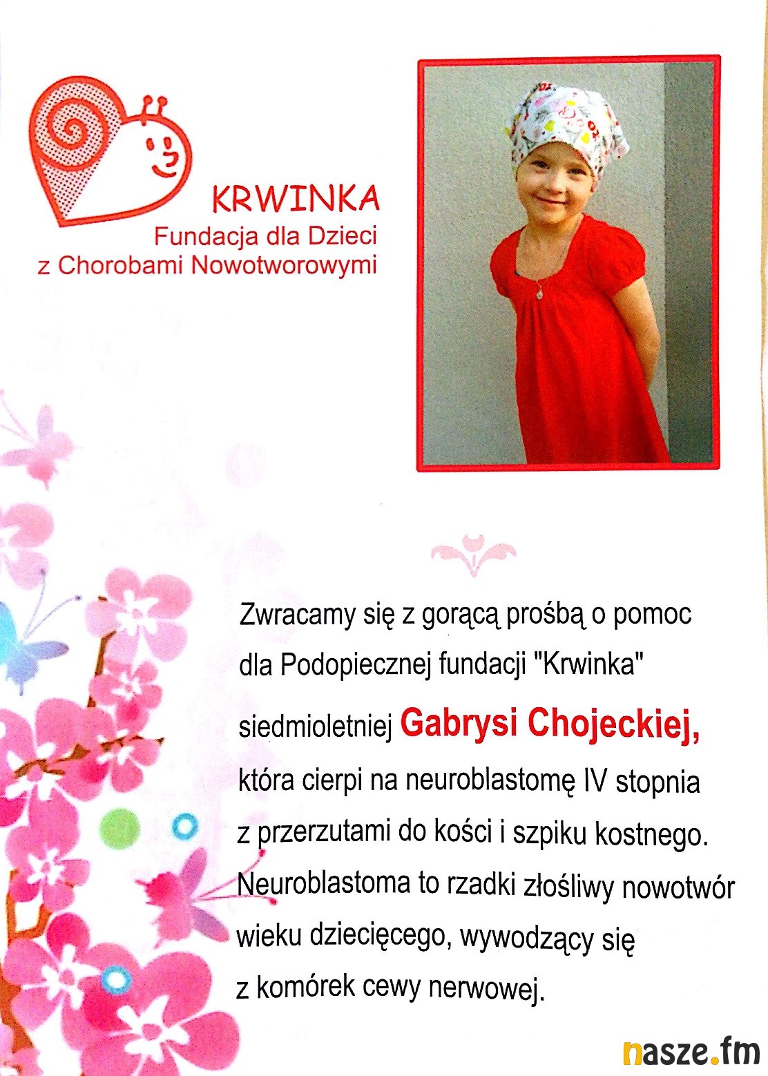 Gabrysia Chojecka mieszka w Orzeżynie (gm. Błaszki) ma 7 lat i choruje na neuroblastomę, to nowotwór złośliwy układu nerwowego.