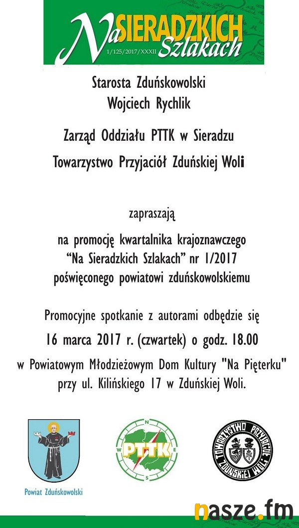 Starosta Zduńskowolski, Zarząd Oddziału PTTK w Sieradzu i Towarzystwo Przyjaciół Zduńskiej Woli zapraszają na promocję kwartalnika krajoznawczego "Na Sieradzkich Szlakach" poświęconego powiatowi zduńskowolskiemu. Promocyjne spotkanie z autorami zaplanowano na dzisiaj.