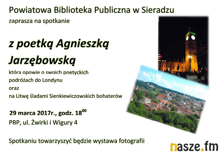 Powiatowa Biblioteka Publiczna w Sieradzu (ul. Żwirki i Wigury 4) zaprasza na spotkanie z Agnieszką Jarzębowską. Poetka dziś (środa 29 marca) opowie o swoich podróżach do Wielkiej Brytanii i na Litwę . Początek o godz. 18:00. Z kolei po godz. 15 będzie gościem Naszego Radia.