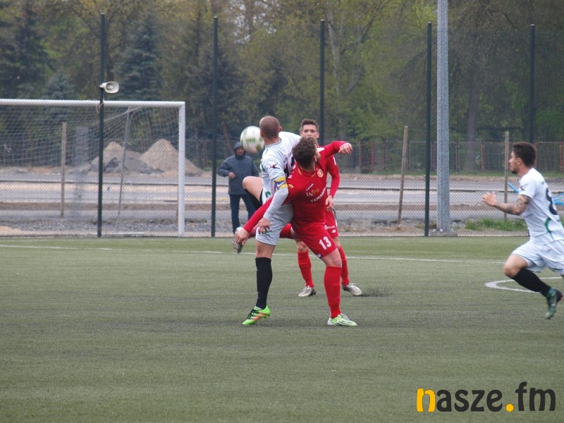 Pierwszą groźną sytuację gospodarze mieli w 35. minucie, kiedy Bartosz Narożnik uderzył w słupek. Nie minęło 10 minut, a w poprzeczkę uderzył Wiktor Płaneta. Do odbitej piłki wyskoczyli; Marcin Nowak i Marcin Kobierski, a sędzia Paweł Pskit odgwizdał faul na kapitanie biało-zielonych. Z 11. metrów strzelił Płaneta, ale się pomylił i do przerwy było 0:0.