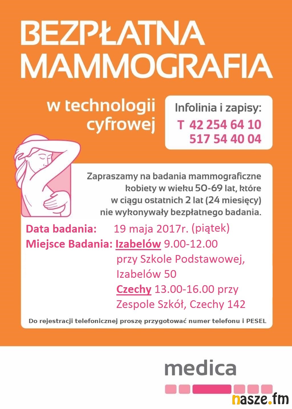 19 maja odbędą się bezpłatne badania mammograficzne. W godzinach 9.00-12.00 badania odbędą się przy Szkole Podstawowej w Izabelowie, a w godzinach 13.00-16.00 przy Zespole Gimnazjum, Szkoły Podstawowej i Przedszkola w Czechach.