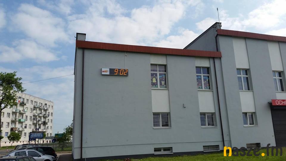Oprócz aktualnej godziny wyświetla także datę i temperaturę. Jest na nim też logo "Aktywna Gmina Błaszki".