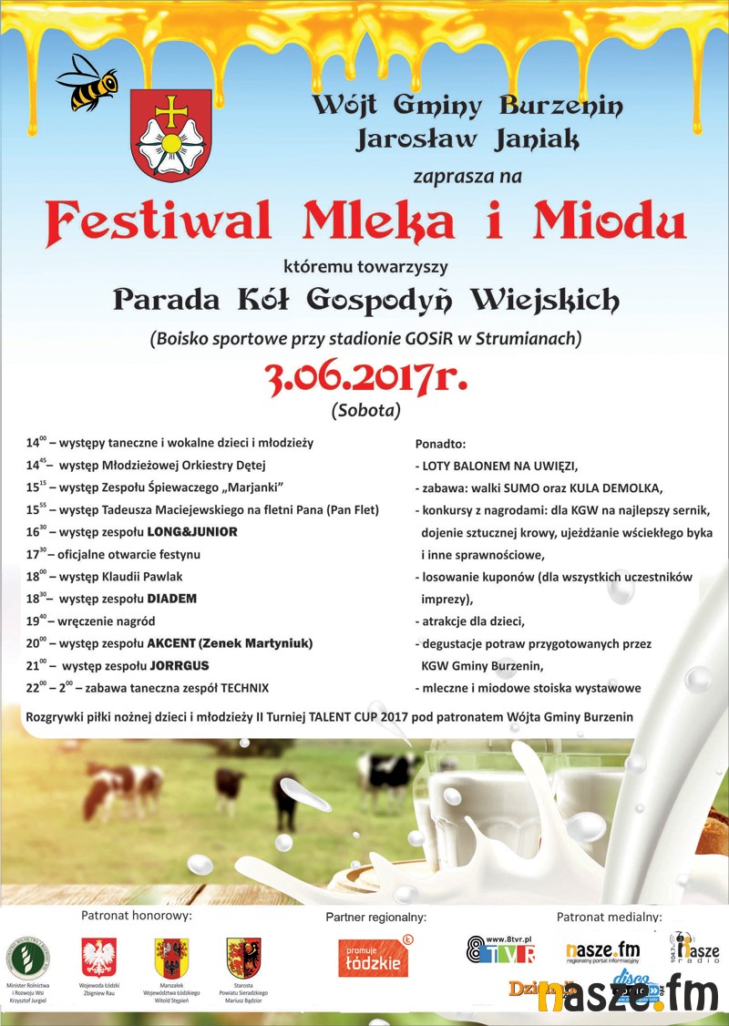 Uroczystego otwarcia Festiwalu Mleka i Miodu dokonał Wójt Burzenina Jarosław Janiak, który wyróżnił również patronów imprezy, sponsorów i gości specjalnych.