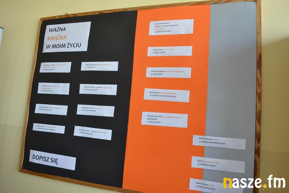 Dziś w ramach akcji opowiedziano o regale do bookcrossingu, na którym znalazły się książki, którymi uczniowie będą mogli się wymieniać. W przypadku, kiedy kogoś zainteresuje dana książka może ją zatrzymać, jednak w zamian musi przynieść inną publikację. W obieg ruszył także notatnik, w którym każdy może odpowiedzieć na pytanie: dlaczego czytasz? Podczas pierwszego dnia akcji rozpoczęto także wspólne głośne czytanie. Dziś dzień fantastyki i Wiedźmin. Sezon Burz autorstwa Andrzeja Sapkowskiego.