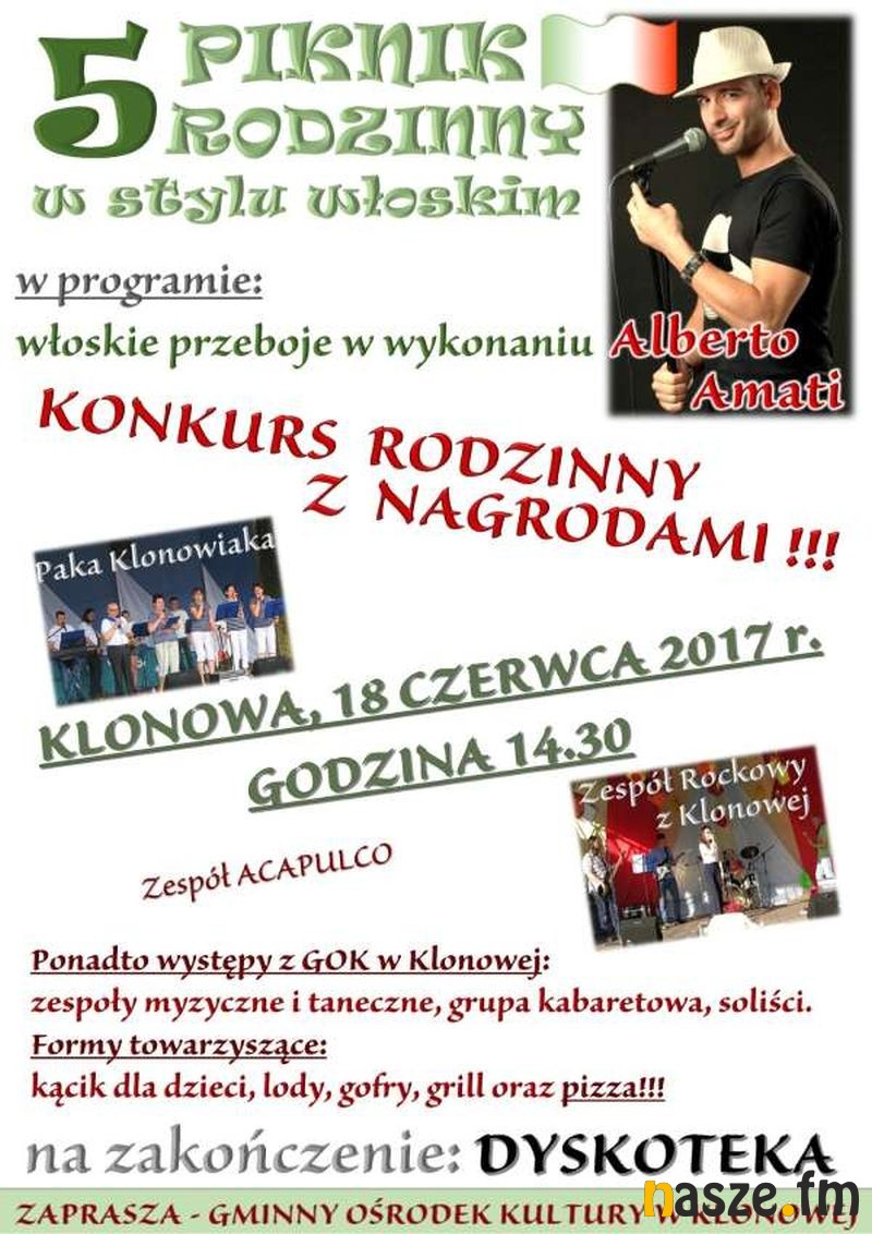 W najbliższą niedzielę w Klonowej odbędzie się 5. edycja Pikniku Rodzinnego w stylu włoskim. W programie koncerty, konkursy i wiele atrakcji.