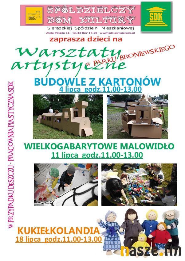 - Zapraszam na cykl warsztatów artystycznych, które będziemy realizować w Parku Broniewskiego. Przez kolejne trzy wtorki będą odbywały się tam warsztaty, wśród nich budowa z kartonów, wielkogabarytowe malowidła oraz kukiełkolandia, czyli tworzenie lalek z gałganków. Zajęcia przeznaczone są dla dzieci w wieku szkolnym. Wszystkie materiały potrzebne do warsztatów zapewnia Spółdzielczy Dom Kultury. W przypadku gdyby pogoda nie dopisała zajęcia zostaną przeniesione do pracowni artystycznej domu kultury - mówi Irena Kostrzewska, kierownik Spółdzielczego Domu Kultury w Sieradzu