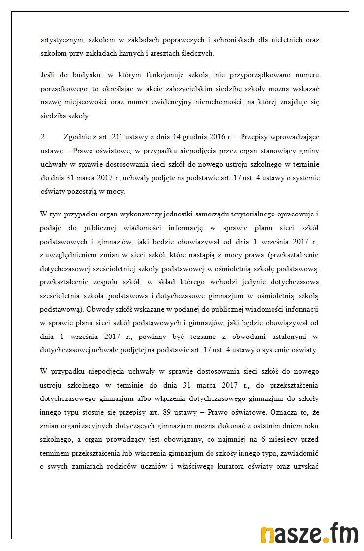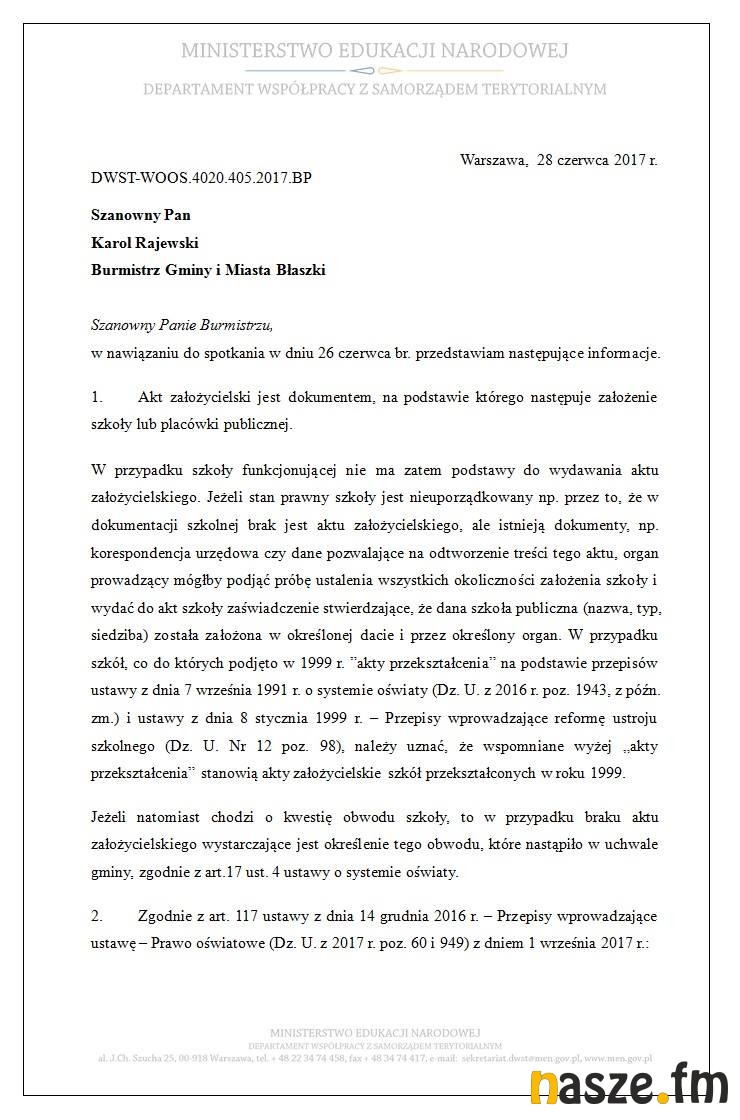 - Otrzymaliśmy pismo z Departamentu Współpracy z Samorządem Terytorialnym Ministerstwa Edukacji Narodowej ze szczególnymi informacjami i wytycznymi, które w tym momencie pomogą mi rozwiązać te naprawdę bardzo poważne problemy prawne w funkcjonowaniu szkół i w końcu wdrożyć reformę oświaty - komentuje burmistrz Błaszek Karol Rajewski.