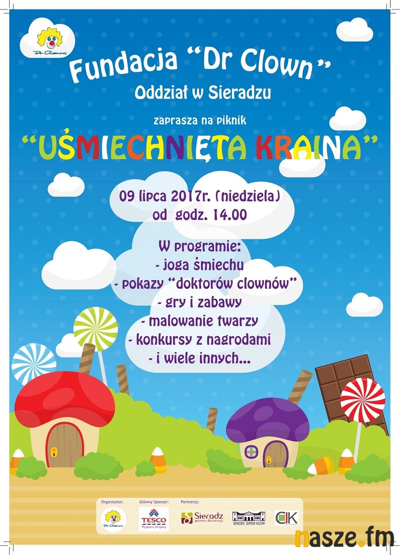 Sieradzki oddział Fundacji Dr Clown zaprasza na kolorowy i wesoły akcent wakacji. W niedzielę sieradzki Rynek zamieni się w Uśmiechniętą Krainę. Jest to też okazja do świętowania 5 lat działalności fundacji w Sieradzu. Początek pikniku o godz. 14:00.