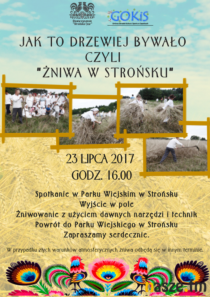 W Strońsku będzie można zobaczyć kosiarzy, żniwiarki i sposób w jaki koszono żyto. Jak zapowiadają organizatorzy nie zabraknie dawnych pieśni, opowieści, które w dawnych czasach towarzyszyły pracom w polu.