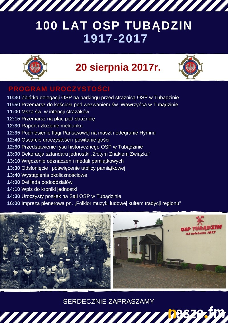 Ochotnicza Straż Pożarna w Tubądzinie ratuje życie i mienie już od 100 lat! Z tej okazji 20 sierpnia odbędą się uroczystości jubileuszowe. Imprezą towarzyszącą będzie Folklor muzyki ludowej kultem tradycji regionu.