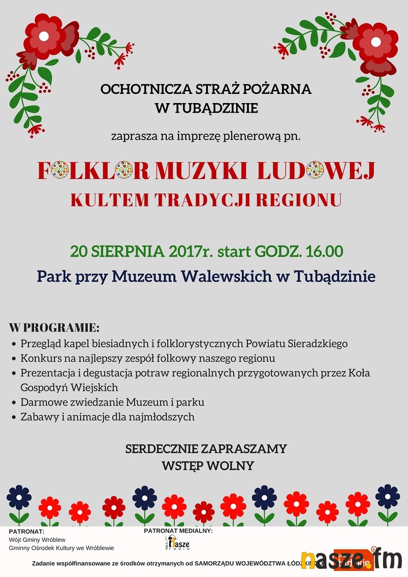 Dokładnie o 16:00 w parku przy Muzeum Walewskich w Tubądzinie odbędzie się impreza plenerowa pn. Folklor muzyki ludowej kultem tradycji regionu.
