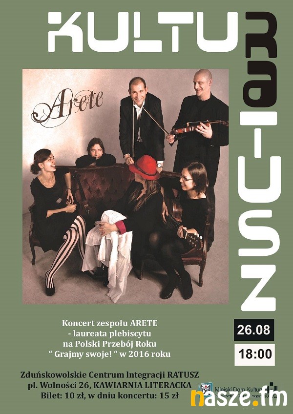 Miejski Dom Kultury w Zduńskiej Woli zaprasza na kolejny koncert z cyklu Kulturatusz. Wystąpi zespół ARETE, laureat plebiscytu na Polski Przebój Roku "Grajmy swoje!" w 2016 r.