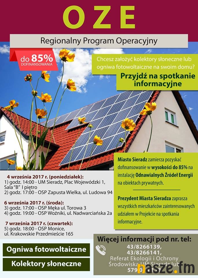Urząd Miasta Sieradza zaprasza mieszkańców na spotkania w sprawie Odnawialnych Źródeł Energii. Pierwsze już jutro o godz. 14:00 w urzędzie, następne o 17:00 w OSP Zapusta Wielka.