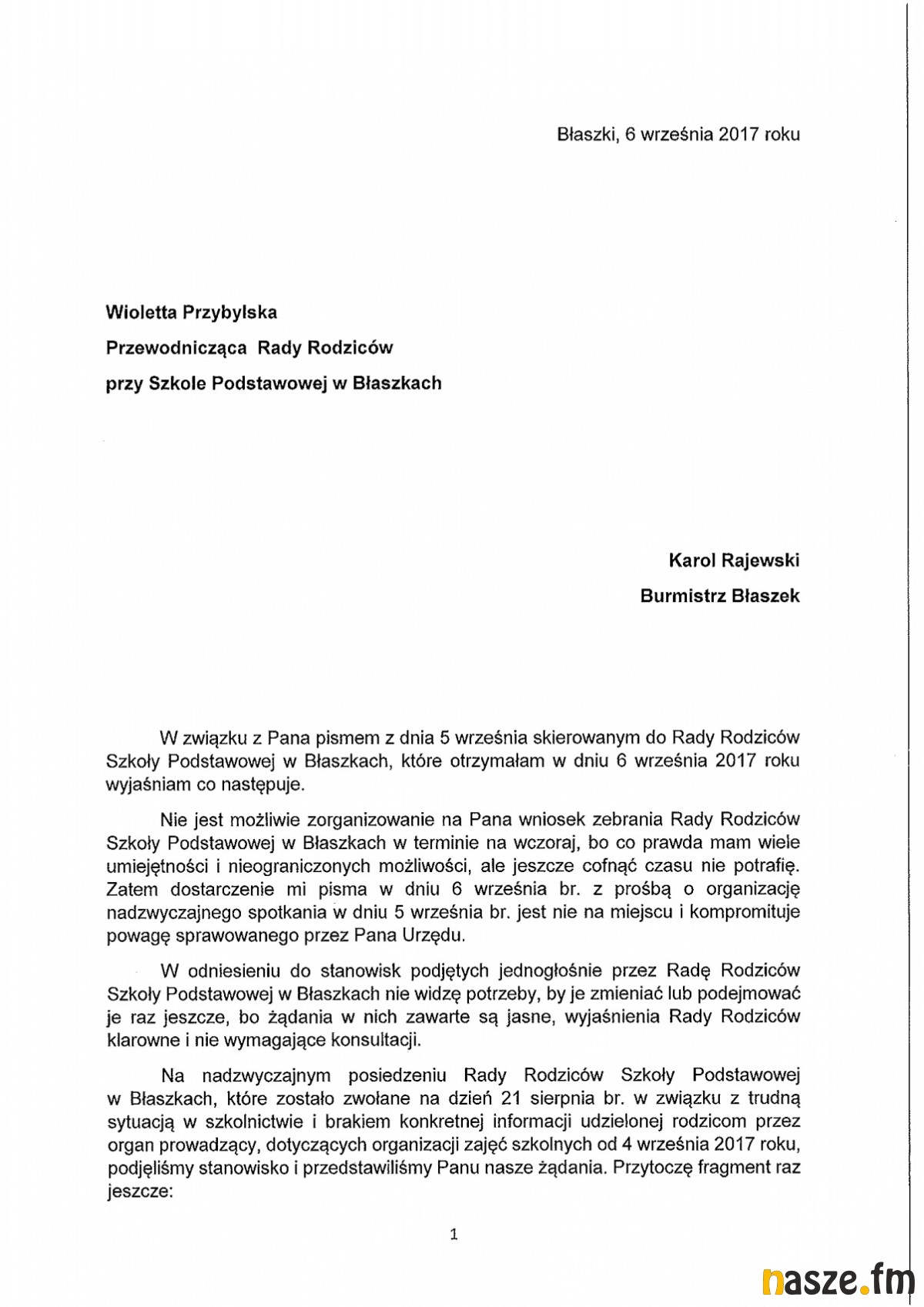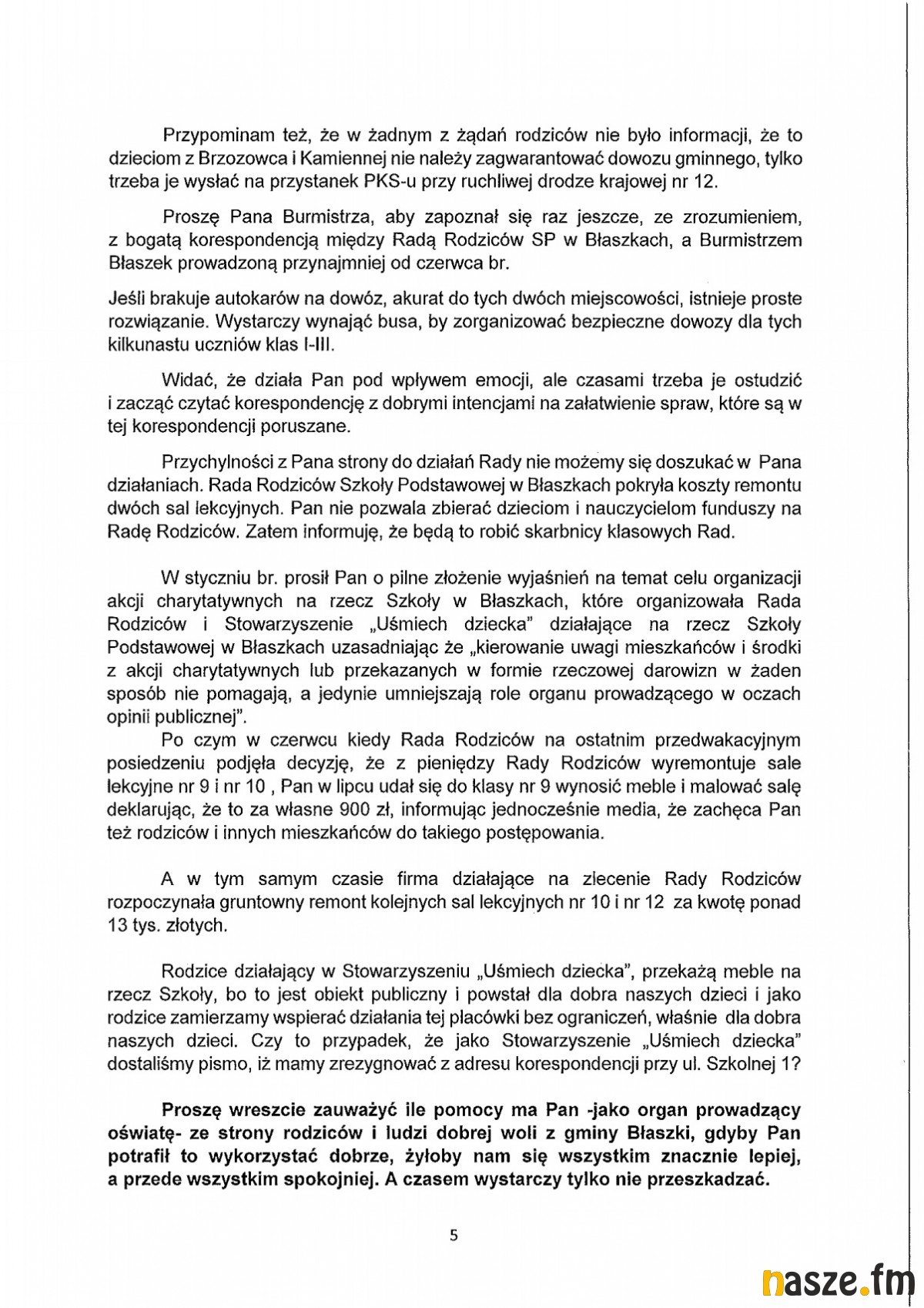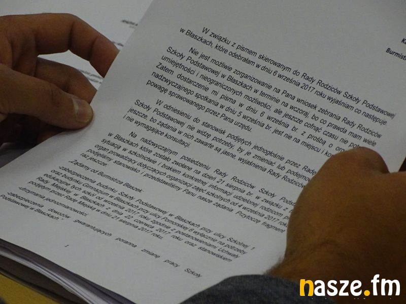 Na sesji radny Krzysztof Konewka przedstawił pismo Wioletty Przybylskiej przewodniczącej Rady Rodziców przy Szkole Podstawowej w Błaszkach do burmistrza Karola Rajewskiego.
