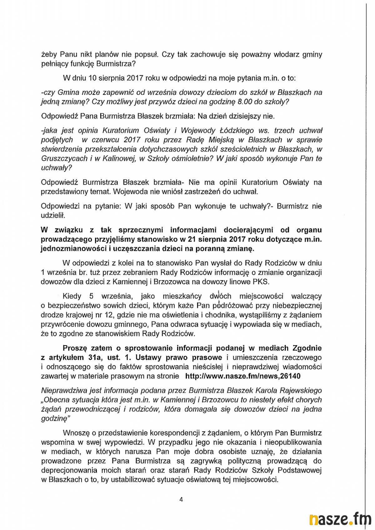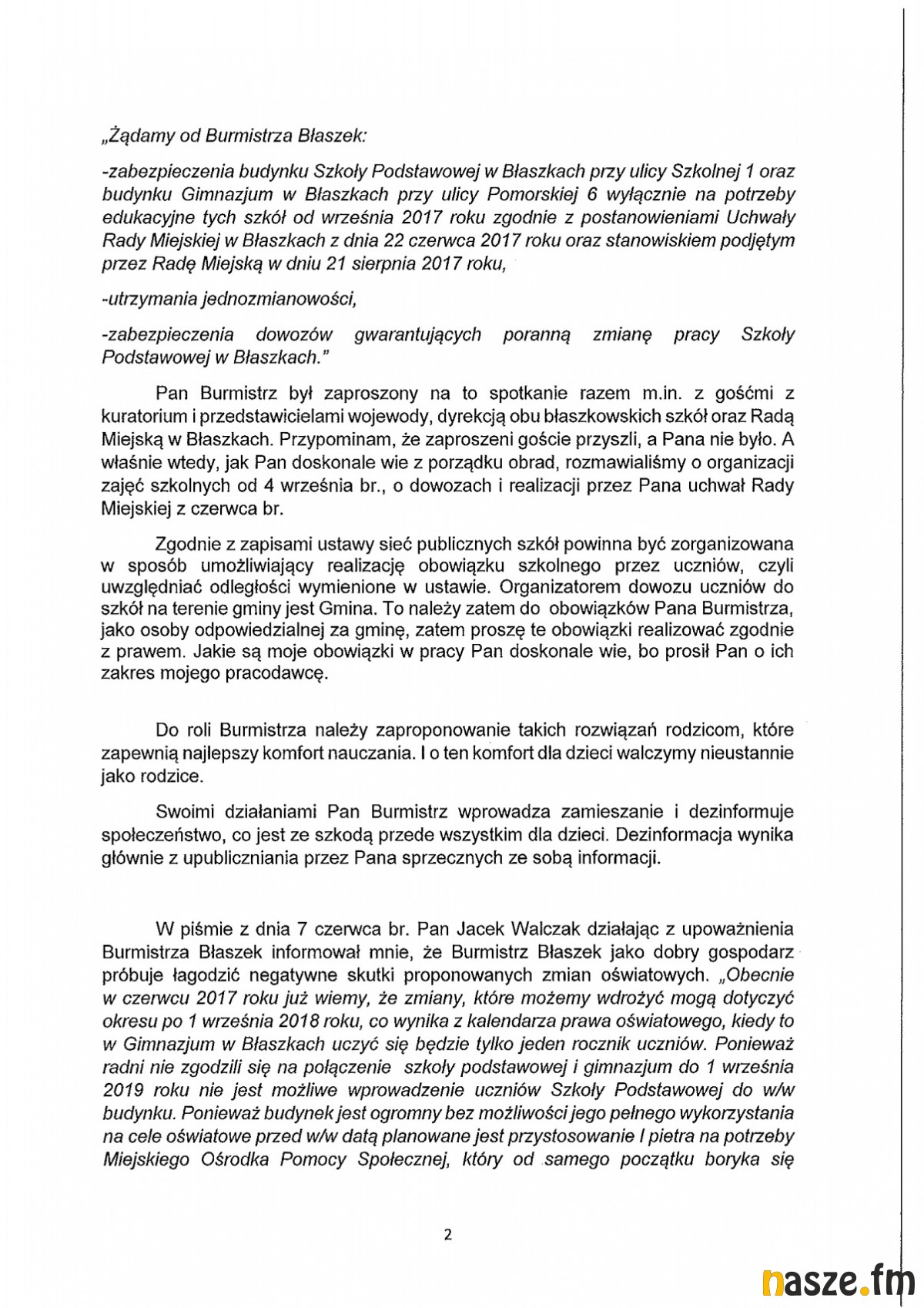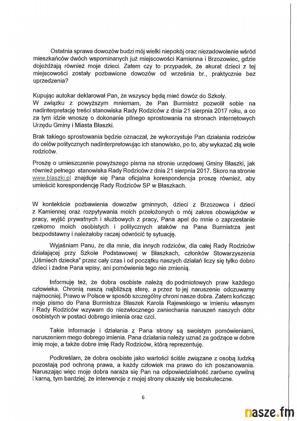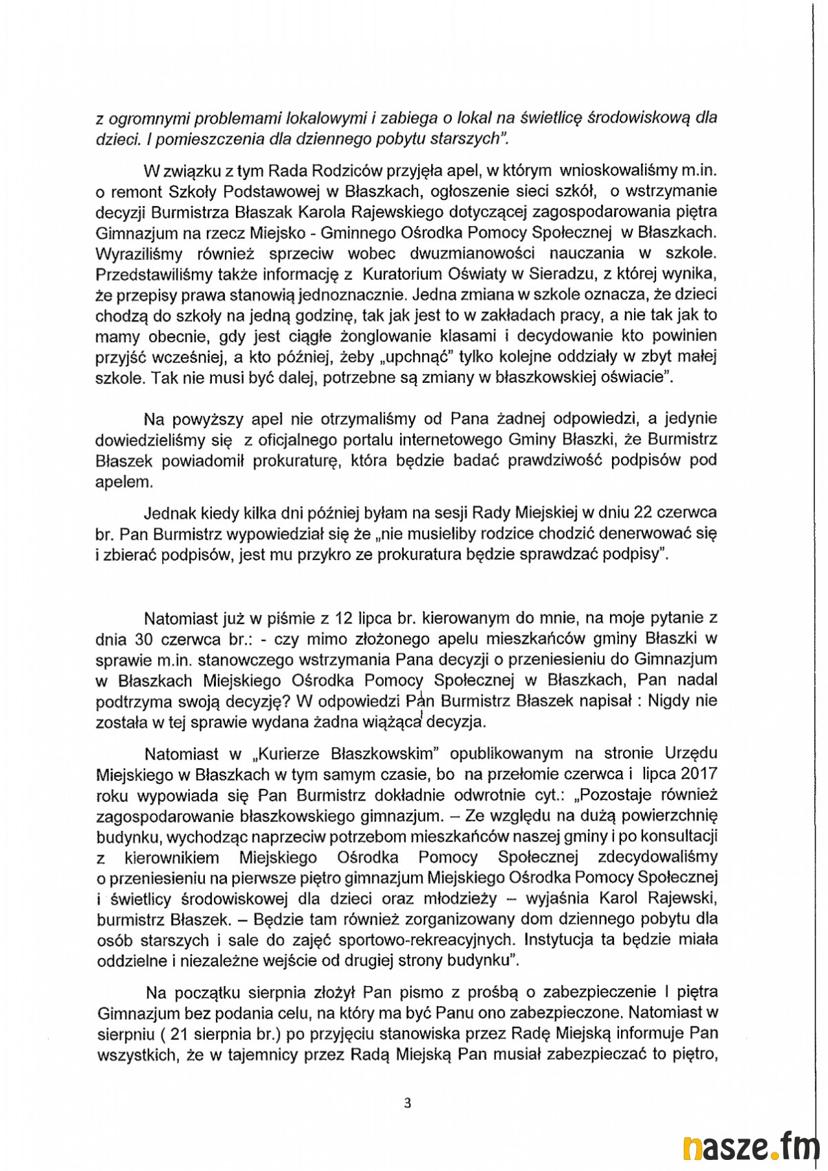 Burmistrz w ten sposób uniemożliwia normalną pracę radnych i tym samym Rady Miejskiej w Błaszkach. (...) Jest to kolejny przykład łamania przez Burmistrza prawa w wypełnianiu obowiązków wynikających ze statutu gminy.