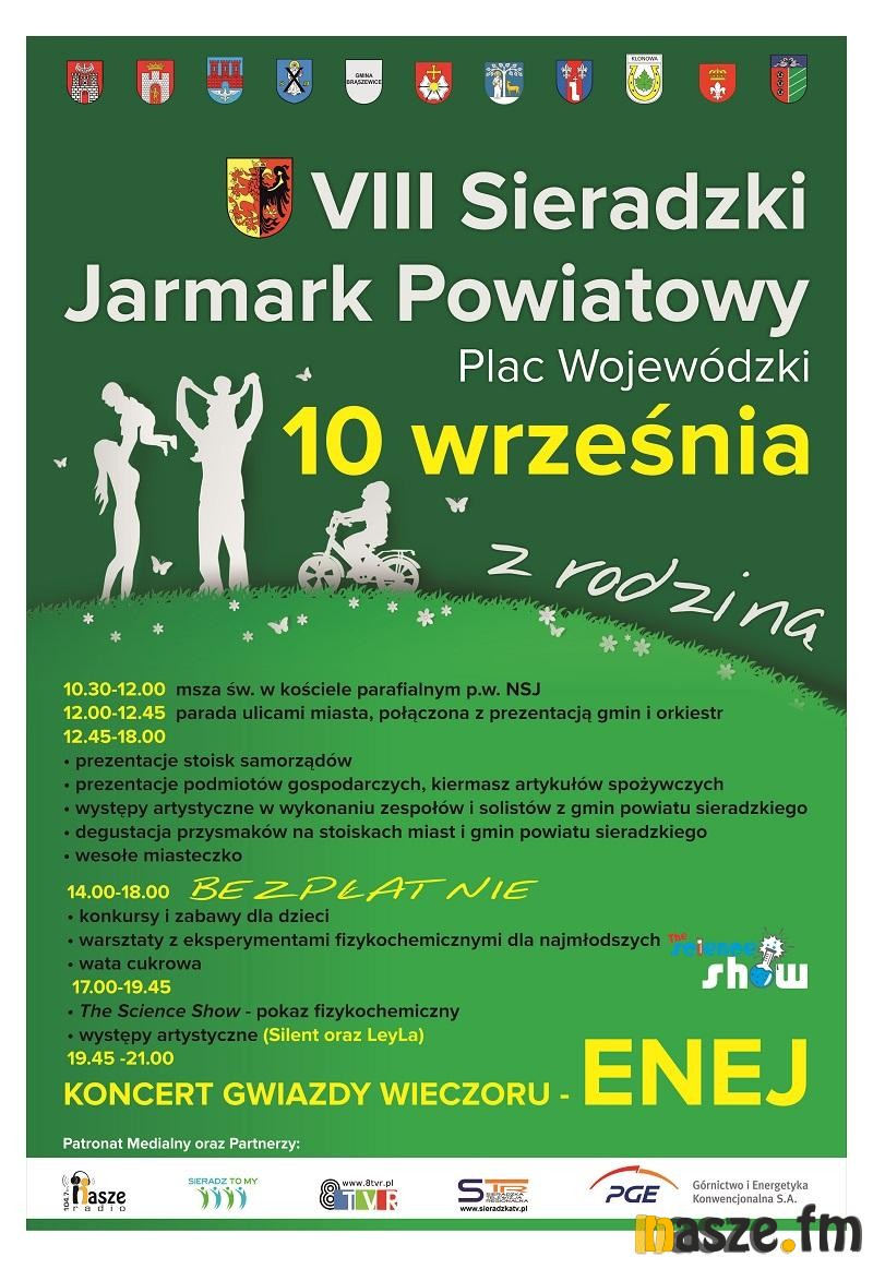 Jarmark poprzedzi msza św. w kościele pw. Najświętszego Serca Jezusowego na os. Jaworowym. Uczestnicy przejdą stamtąd ulicami miasta przed gmach starostwa. Jak co roku zaprezentują się w ten sposób wszystkie gminy z terenu powiatu sieradzkiego. Na odwiedzających jarmark będą czekały stoiska poszczególnych samorządów; gminy będą w ten sposób prezentowały swój dorobek i atrakcje, którymi kuszą turystów czy letników. Oczywiście będzie też można liczyć na różne smakołyki serwowane przez koła gospodyń wiejskich. Na najmłodszych czekać będzie wesołe miasteczko. Nowością na jarmarku będzie The Science Show, czyli pokaz fizykochemiczny. Gwiazdą wieczoru będzie zespół Enej (godz. 19.45). Uwaga, w związku z organizacją wydarzenia kierowcy muszą liczyć się z utrudnieniami w ruchu w obrębie pl. Wojewódzkiego, który będzie zamknięty na czas organizacji imprezy.