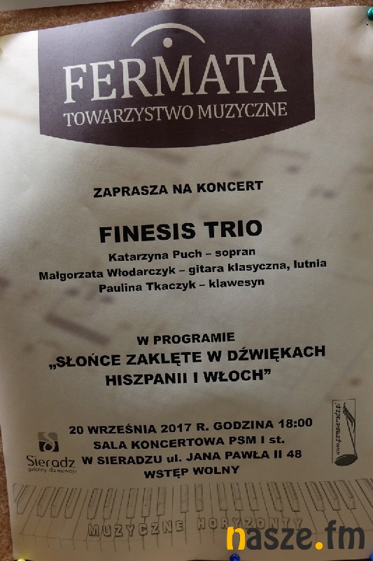 - Melomani mogli ogrzać się w promieniach słońca, a to za sprawą programu przedstawionego przez Finesis Trio ( w skład zespołu wchodzą Katarzyna Puch - sopran, Małgorzata Włodarczyk - gitara i lutnia oraz Paulina Tkaczyk - klawesyn) . Klawesyn i lutnia to instrumenty, które bardzo rzadko widzimy i słyszymy podczas koncertów odbywających się w Sieradzu. Pięknie zabrzmiał klawesyn będący repliką flamandzkiego klawesynu Andreasa Ruckersa z 1637 r. Równie dobrze brzmiała lutnia i gitara w rękach pani Małgorzaty Włodarczyk. Pojawiły się zapowiadane muzyczne perełki, a były nimi choćby pieśni hiszpańskie ze zbioru Musica Barocca Espanola, które z wielką gracją i wdziękiem interpretowała pani Katarzyna Puch. Pieśni z tego zbioru wykonywane są niezmiernie rzadko, a w Polsce ten repertuar wykonuje tylko Finesis Trio. W Sieradzu instrumentalistki Małgorzata Włodarczyk i Paulina Tkaczyk wykonały po raz pierwszy Sonatę VI C - dur Tommasa Giordaniego, która od teraz na stałe wejdzie do programu zespołu. Chaconna F - dur Jaquesa Duphly'ego wywarła na słuchaczach silne wrażenie brawurowo wykonana przez Paulinę Tkaczyk. Uczniowie szkoły muzycznej, jak również wszyscy obecni na koncercie mogli dowiedzieć się wielu ciekawostek - o każdym kompozytorze i utworze, padło kilka słów wprowadzających, teksty pieśni zostały przetłumaczone. Omówione zostały również różnice między współczesną a hiszpańską i angielską gitarą - relacjonuje Sławomir Cieślak, prezes Towarzystwa Muzycznego Fermata, które koncert zorganizowało.