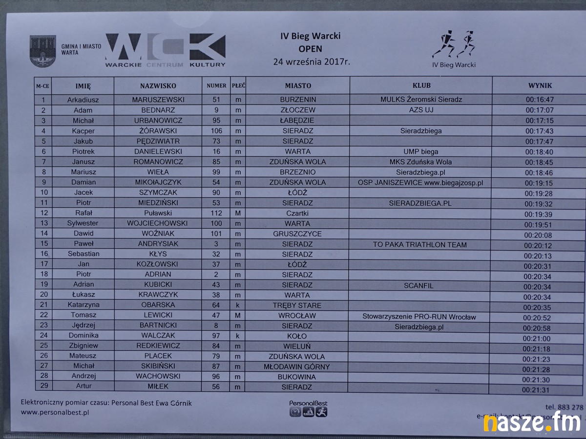 Dziś odbyła się czwarta edycja Biegu Warckiego. Na starcie stanęło 95 zawodników. Wygrał Arkadiusz Maruszewski z Burzenina, który reprezentował barwy MULKS Żeromski Sieradz. Trasę 5 km po ulicach miasta pokonał w czasie 16:47.