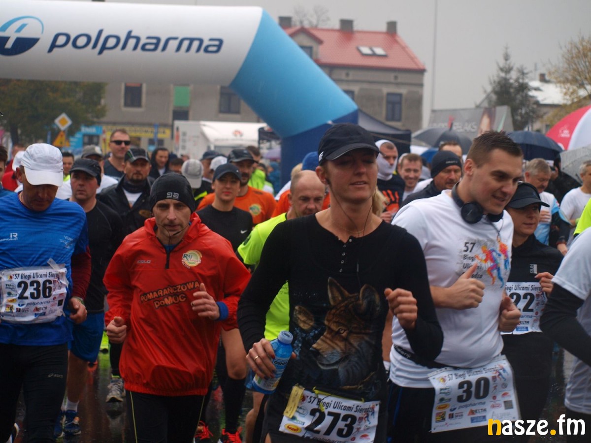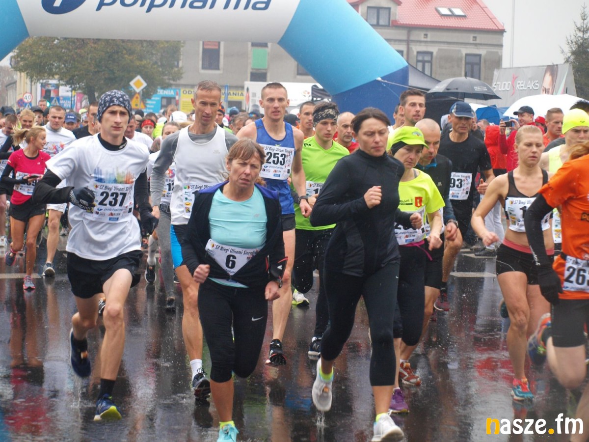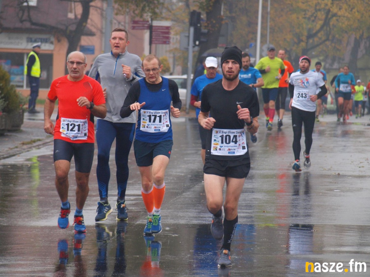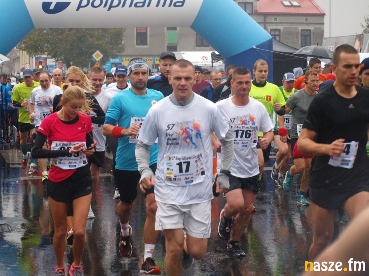 Pogoda nie rozpieszczała uczestników. Deszcz nie mógł jednak odstraszyć prawdziwych miłośników biegania. Jak zwykle największa liczba osób (266) wzięła udział w biegu głównym na dystansie 10 km. Najszybszy na dwóch pięciokilometrowych pętlach był dziś zawodnik RKS Łódź Patryk Stypułkowski, który tym samym poprawił swoje ubiegłoroczne osiągnięcie, przegrał wtedy ze swoim klubowym kolegą Tomaszem Osmulskim. Triumfator 57. edycji Biegów Ulicami Sieradza uzyskał czas 32:35 min, i wyprzedził drugiego na mecie Jędrzeja Hasiurę (także RKS) o blisko półtorej minuty. Jako trzeci linię mety minął wychowanek MULKS MOS Sieradz, obecnie także zawodnik RKS Maciej Nitka. Wśród pań najszybsza była dziś Ewelina Bartocha z Lisowa, która wynikiem 41:51 poprawiła rekord życiowy. Na podium w kategorii kobiet stanęły ponad to: Magdalena Włodarczyk (Wieluń Biega) i Arleta Matysiak (RajSport Active).