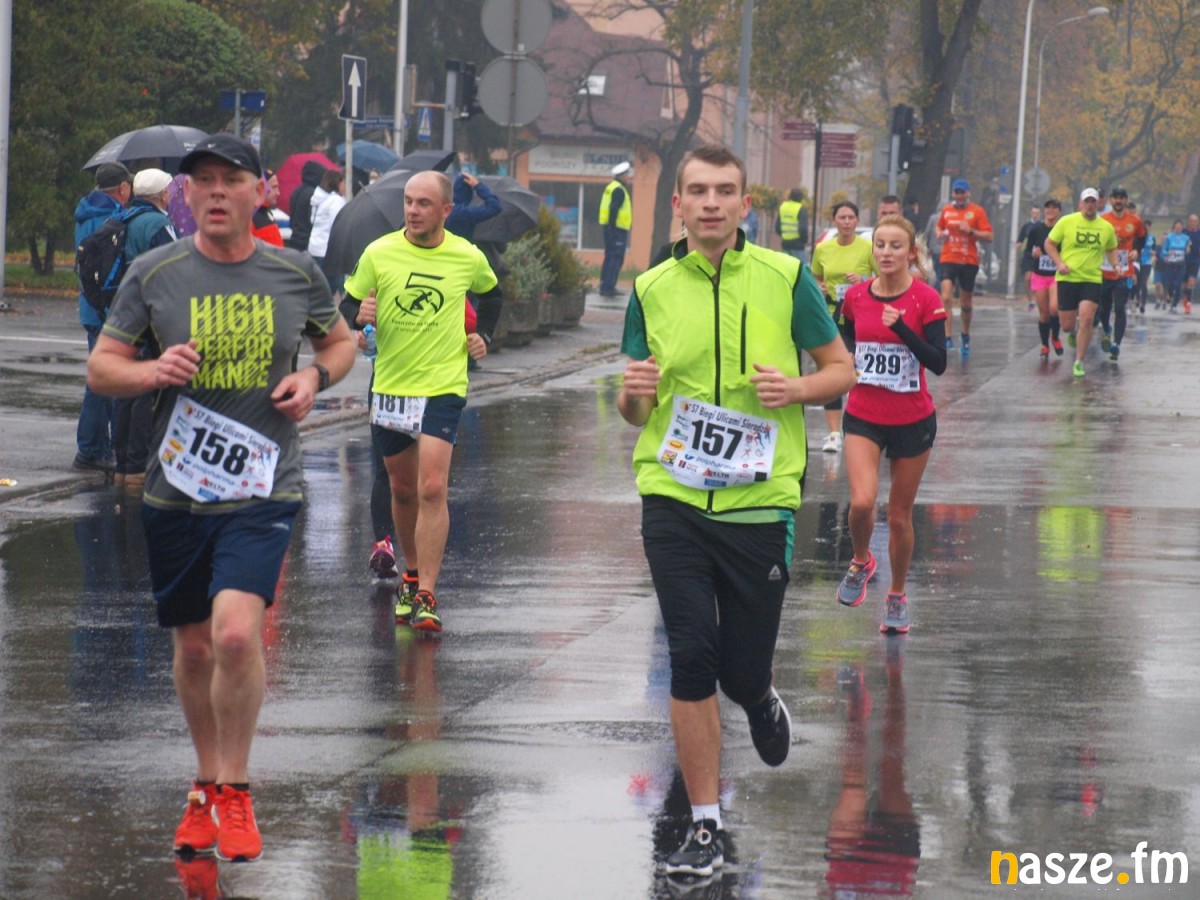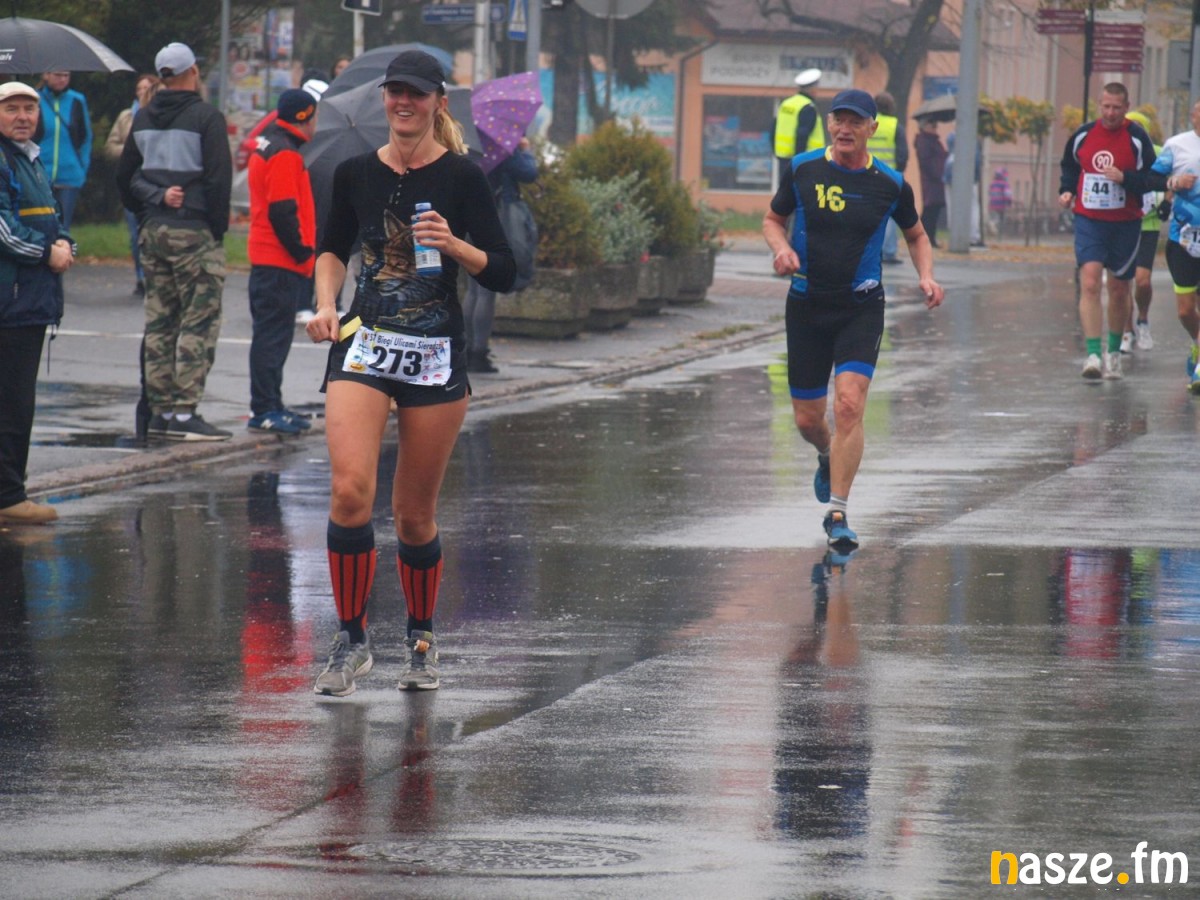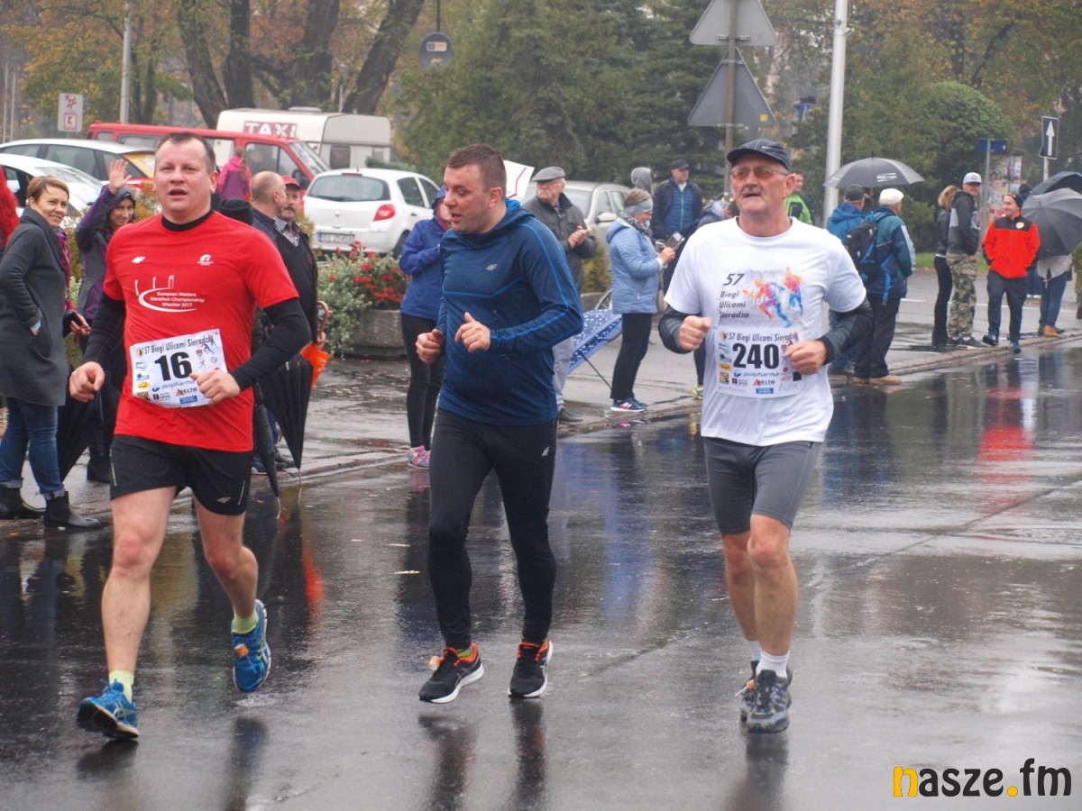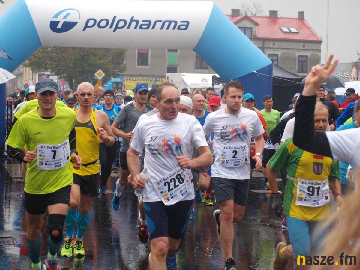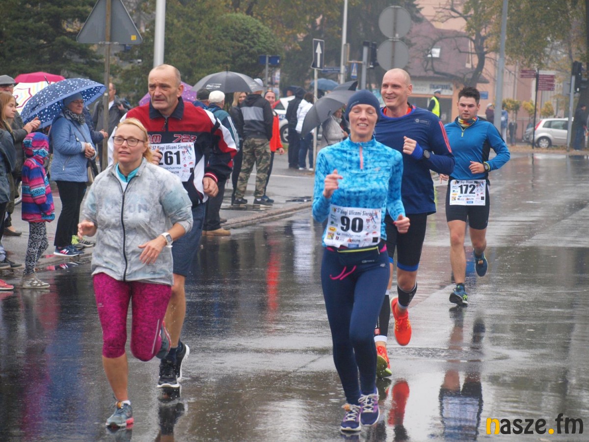 Pogoda nie rozpieszczała uczestników. Deszcz nie mógł jednak odstraszyć prawdziwych miłośników biegania. Jak zwykle największa liczba osób (266) wzięła udział w biegu głównym na dystansie 10 km. Najszybszy na dwóch pięciokilometrowych pętlach był dziś zawodnik RKS Łódź Patryk Stypułkowski, który tym samym poprawił swoje ubiegłoroczne osiągnięcie, przegrał wtedy ze swoim klubowym kolegą Tomaszem Osmulskim. Triumfator 57. edycji Biegów Ulicami Sieradza uzyskał czas 32:35 min, i wyprzedził drugiego na mecie Jędrzeja Hasiurę (także RKS) o blisko półtorej minuty. Jako trzeci linię mety minął wychowanek MULKS MOS Sieradz, obecnie także zawodnik RKS Maciej Nitka. Wśród pań najszybsza była dziś Ewelina Bartocha z Lisowa, która wynikiem 41:51 poprawiła rekord życiowy. Na podium w kategorii kobiet stanęły ponad to: Magdalena Włodarczyk (Wieluń Biega) i Arleta Matysiak (RajSport Active).