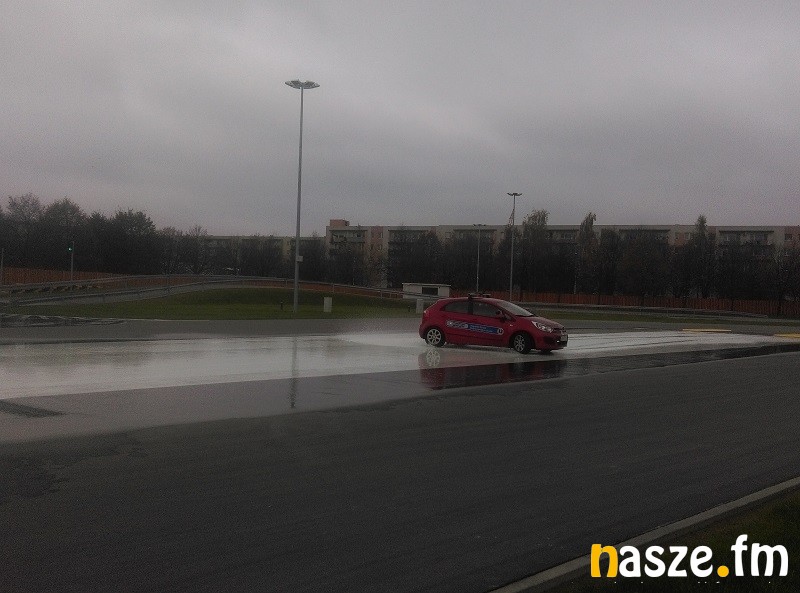 Po części teoretycznej przyszedł czas na zajęcia praktyczne na torze. Strażacy podzieleni na kilka grup mieli do dyspozycji trzy samochody egzaminacyjne wraz z asystą egzaminatorów. Wrażenie zrobił zwłaszcza tor z szarpakiem, który wprowadza auto w stan poślizgu, z którego należy próbować wyprowadzić auto oraz ominąć kurtyny wodne.
