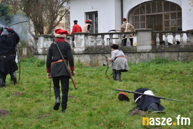 Po ślubowaniu nadszedł czas na żywą lekcję historii. W magicznej scenerii dworu należącego niegdyś do rodziny Szweycerów rozegrał się epizod z powstania styczniowego. W role dziedzica, powstańców i żołnierzy carskich wcielili się kadeci, którzy z udziałem grupy rekonstrukcyjnej niezwykle realistycznie przedstawili sceny bitwy z 1863 roku. Wystrzały armatnie, walka kosynierów i okrucieństwo carskiego wojska wobec dziedzica Wincentego Szweycera wywarły na publiczności ogromne wrażenie. Wyjątkowe emocje towarzyszyły obecnej na Ślubowaniu wnuczce Janusza Szweycera p. Barbarze Szweycer - Buks. W 1917 r. w majątku jej dziadka odbywały się szkolenia legionistów. Potem Janusz walczył z bolszewikami w 1920 r. W 1939 r. został aresztowany przez Niemców.
