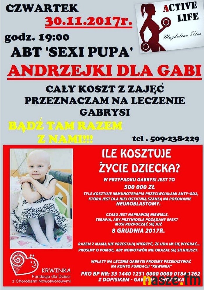 W czwartek ( 30 listopada) w Szkole Podstawowej nr 10 w Sieradzu Magda Ulas poprowadzi zajęcia fitness, z których cały dochód będzie przeznaczony na leczenie dziewczynki. Zajęcia rozpoczną się o godz. 19:00 w małej sali gimnastycznej.