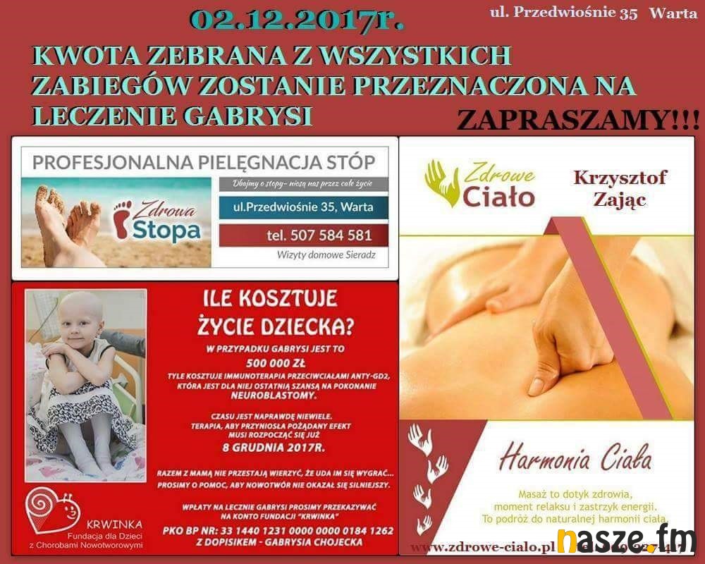 Gabrysia Chojecka mieszka w Orzeżynie (gm. Błaszki) ma 8 lat i choruje na neuroblastomę, to nowotwór złośliwy układu nerwowego. Dziewczynka ma szansę na powrót do zdrowia, ale potrzeba jeszcze 500 tys. zł, żeby mogła rozpocząć specjalistyczne leczenie. Kwota musi zostać zebrana do 8 grudnia.