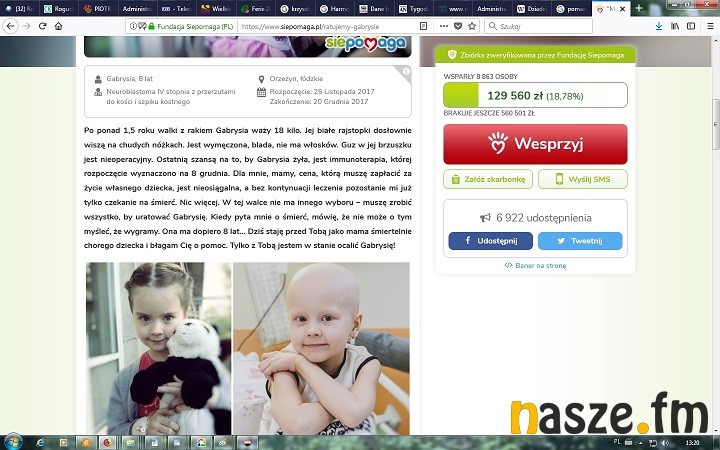 O walce dziewczynki z rakiem pisaliśmy przed rokiem, kiedy odbył się kiermasz świąteczny połączony ze zbiórką pieniędzy na jej leczenie. Gabrysia i jej bliscy maja nadzieję , że zaproponowana terapia, na którą teraz prowadzona jest zbiórka, przyniesie oczekiwany efekt.