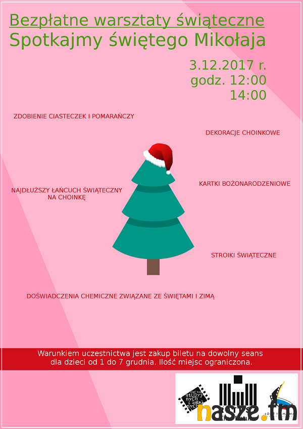 Kino Ratusz zaprasza na bezpłatne warsztaty świąteczne "Spotkajmy świętego Mikołaja". W programie m.in. zdobienie ciasteczek i pomarańczy i innych dekoracji choinkowych, doświadczenia chemiczne związane z zimą i świętami.