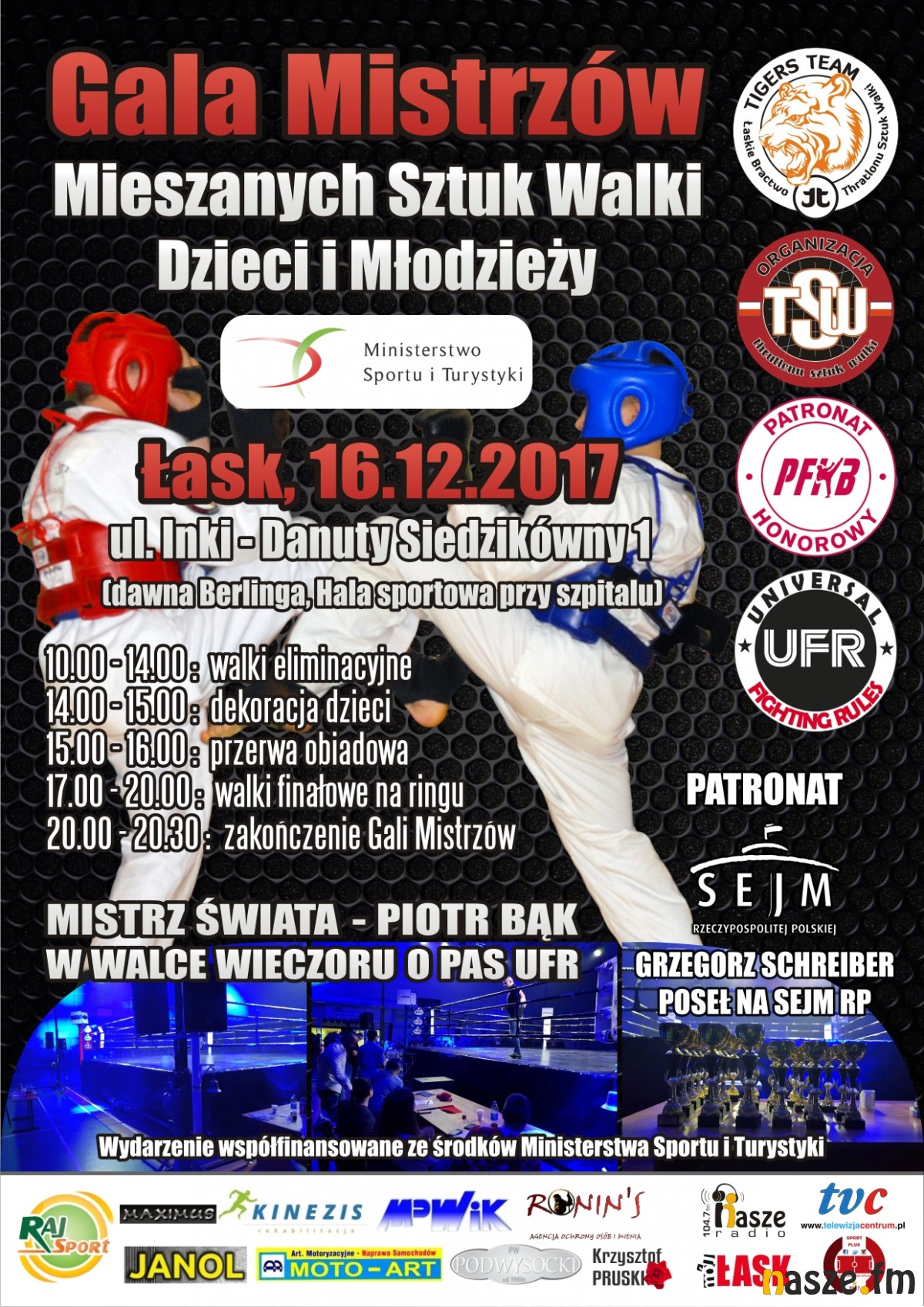 Gala odbędzie się sobotę (16.12) w hali przy ul. Inki-Danuty Siedzikówny 1 (dawna ul. Berlinga). Walki eliminacyjne rozpoczną się o 10:00, na 14:00 zaplanowano uroczystą dekorację zwycięzców w młodszych kategoriach. O 17:00 rozpoczną się walki wieczoru, w tym pojedynek łaskowianina Piotra Bąka o pas Zawodowego Mistrza Polski UFR.