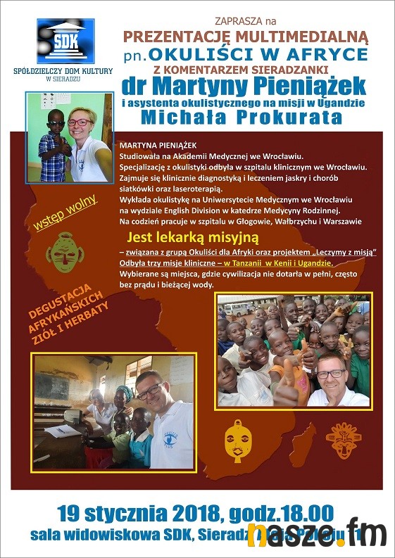 Spółdzielczy Dom Kultury w Sieradzu zaprasza 19 stycznia na prezentację multimedialną" Okuliści w Afryce", którą przygotowała i poprowadzi dr Martyna Pieniążek. Towarzyszyć jej będzie Michał Prokurat.