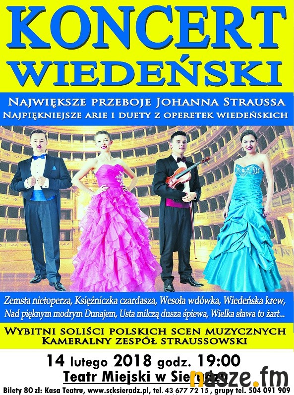 W środę 14 lutego w Teatrze Miejskim w Sieradzu odbędzie się koncert z udziałem solistów polskich i europejskich oper. Koncert programowo nawiązywał będzie do tradycyjnych gali i noworocznych koncertów, odbywających się w Wiedniu.