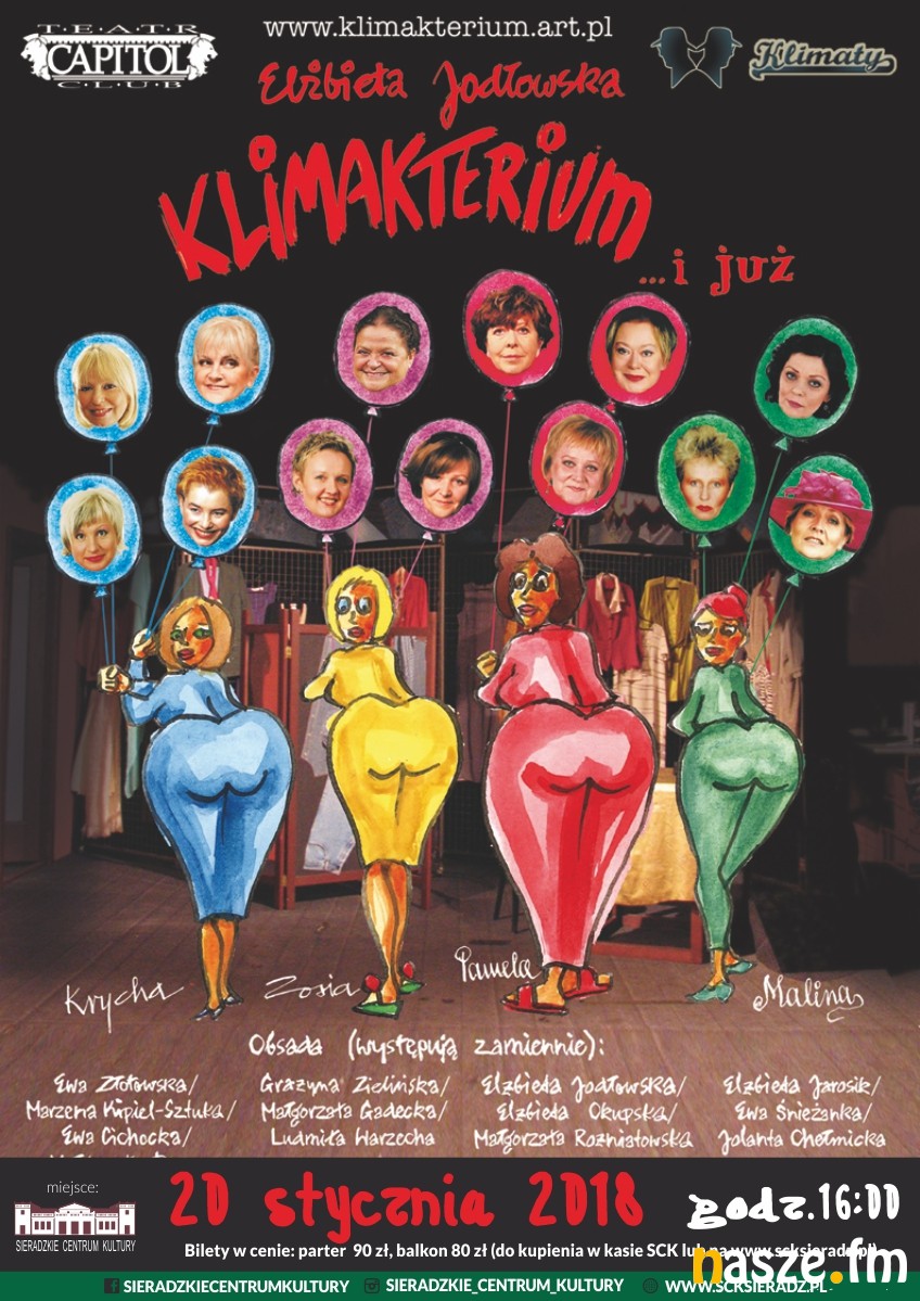 W najbliższą sobotę w Sieradzkim Centrum Kultury wystawiony zostanie spektakl "Klimakterium ... i już". Na scenie wystąpią: Elżbieta Jodłowska,Katarzyna Kozak,Ewa Cichocka, Małgorzata Gadecka. Początek o godzinie 16.